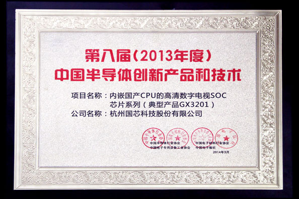 2014年3月14日,在無錫舉辦的“2014 中國半導體市場年會暨第三屆集成電路產(chǎn)業(yè)創(chuàng)新大會”上,杭州國芯榮獲第八屆(2013 年度)中國半導體創(chuàng)新產(chǎn)品和技術獎。